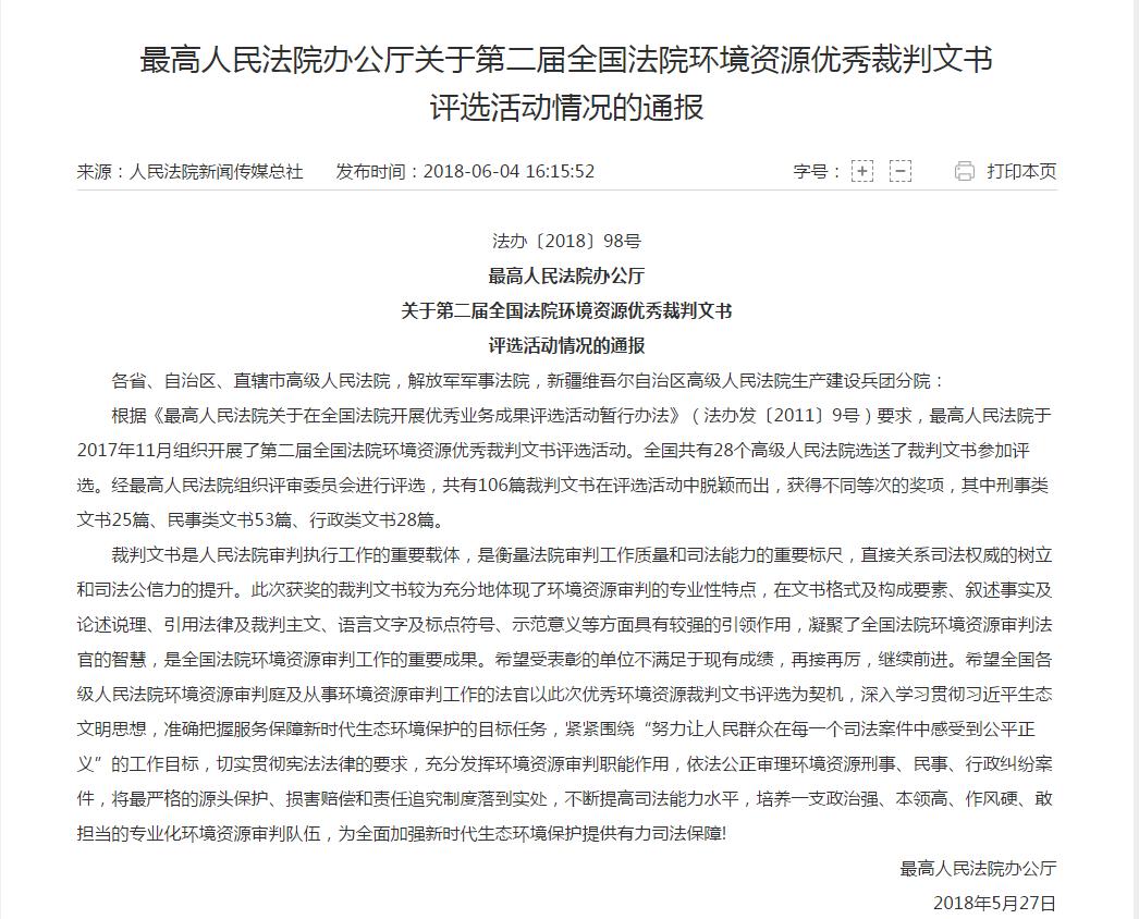 2018年6月4日下午,最高人民法院举行“人民法院服务保障新时代生态文明建设新闻发布会”。会上,最高人民法院环境资源审判庭副庭长魏文超通报了典型案例相关情况,其中,宜昌市西陵区法院审理的宜昌市西陵区人民检察院诉利川市林业局不履行法定职责行政公益诉讼案入选最高法新时代生态文明建设十大典型案例,湖北省宜昌市西陵区人民法院(2017)鄂0502行初1号行政判决书获得行政类裁判文书特等奖。