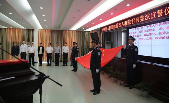 (宋峰)“我是中华人民共和国法官,我宣誓:忠于中华人民共和国宪法,维护宪法权威,履行法定职责,忠于祖国、忠于人民,恪尽职守、廉洁奉公,接受人民监督,为建设富强、民主、文明、和谐的社会主义国家努力奋斗!”5月17日上午,西陵区人民法院党组书记、院长方正权带领首次入额的23名法官,面向国旗,手持宪法,庄严宣誓。