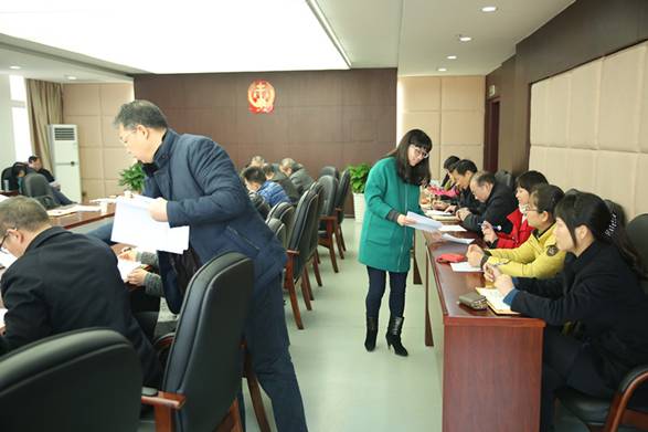 12月31日,西陵区人民法院召开2014年度述职述廉暨民主测评大会,区委常委、副区长周宜琴,区委考评组组长、区直机关工委副书记汪桂兰等一行四人到会指导,会议由区委考评组组长汪桂兰主持,全院中层以上干部及普通干警代表、离退休代表等三十余人参加会议。